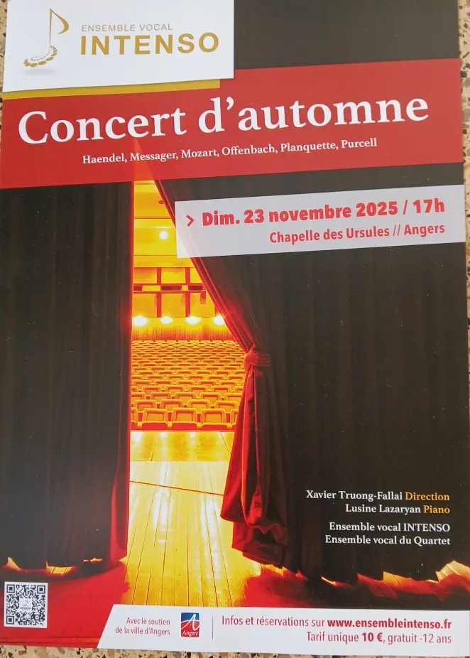INTENSO and Le Quartet, vocal ensembles directed by Xavier Truong-Fallai, invite opera lovers to their autumn concert at the Chapelle des Ursules in Angers. The program features opera and operetta arias by Handel, Messager, Mozart and Offenbach.