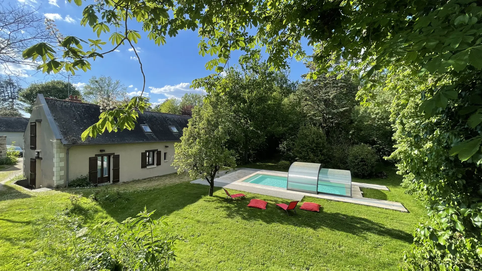 Discover Domaine Jeanne de Laval, nestled in the heart of the Loire Anjou Touraine Regional Nature Park, a UNESCO World Heritage site. Located on the banks of the Loire, just 15 min from Angers by car and 10 min by train, this gîte is the ideal base for exploring the famous Châteaux of the Loire. Enjoy a living room with fireplace, a fully-equipped kitchen, 2 bedrooms, a bathroom and a heated, covered swimming pool. For the ultimate in relaxation, take advantage of our wellness area, including sauna and spa, during your stay!