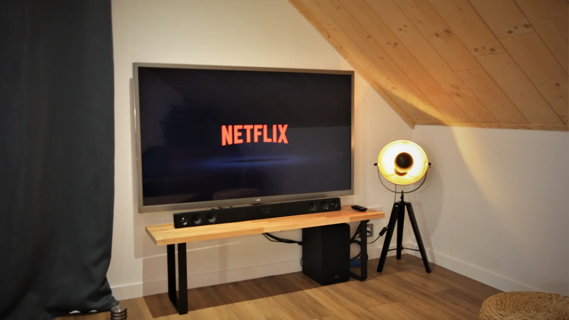 y sillón, mesa de centro, gran televisor de pantalla plana y barra de sonido (volumen a ajustar para respetar la tranquilidad de todos).