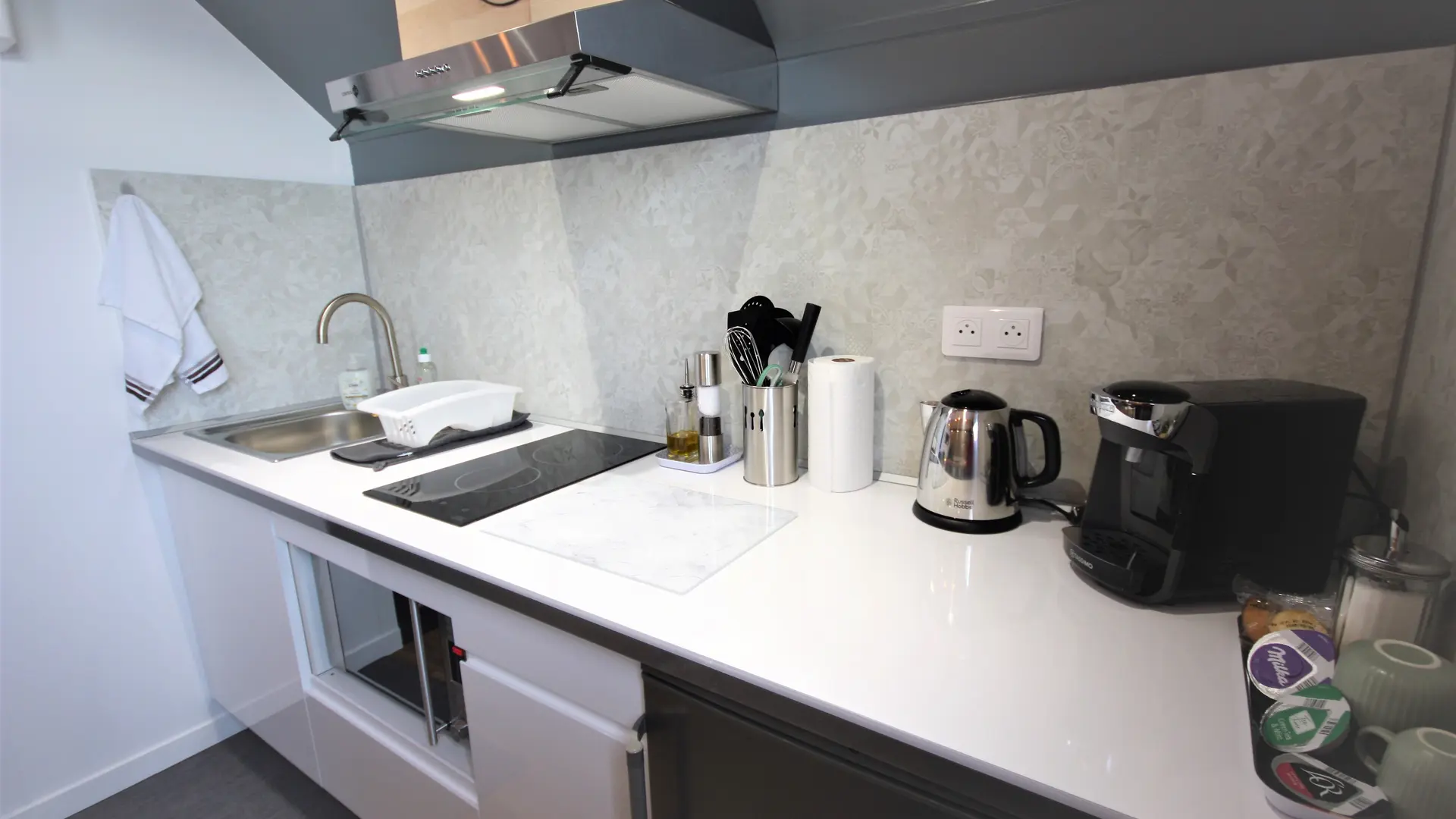 - Una cocina totalmente equipada: placa de inducción de 2 fuegos, horno multifunción (microondas, convección y grill), frigorífico con congelador, fregadero, hervidor de agua, cafetera de émbolo para los amantes del café y máquina Tassimo para los que tienen prisa. Una bebida caliente gratuita (café, té o chocolate) por noche reservada. Por supuesto, se proporciona vajilla y cubertería, así como azúcar, aceite, pimienta y sal.