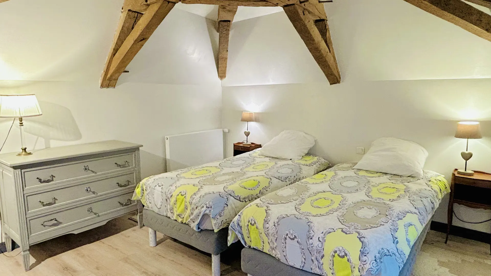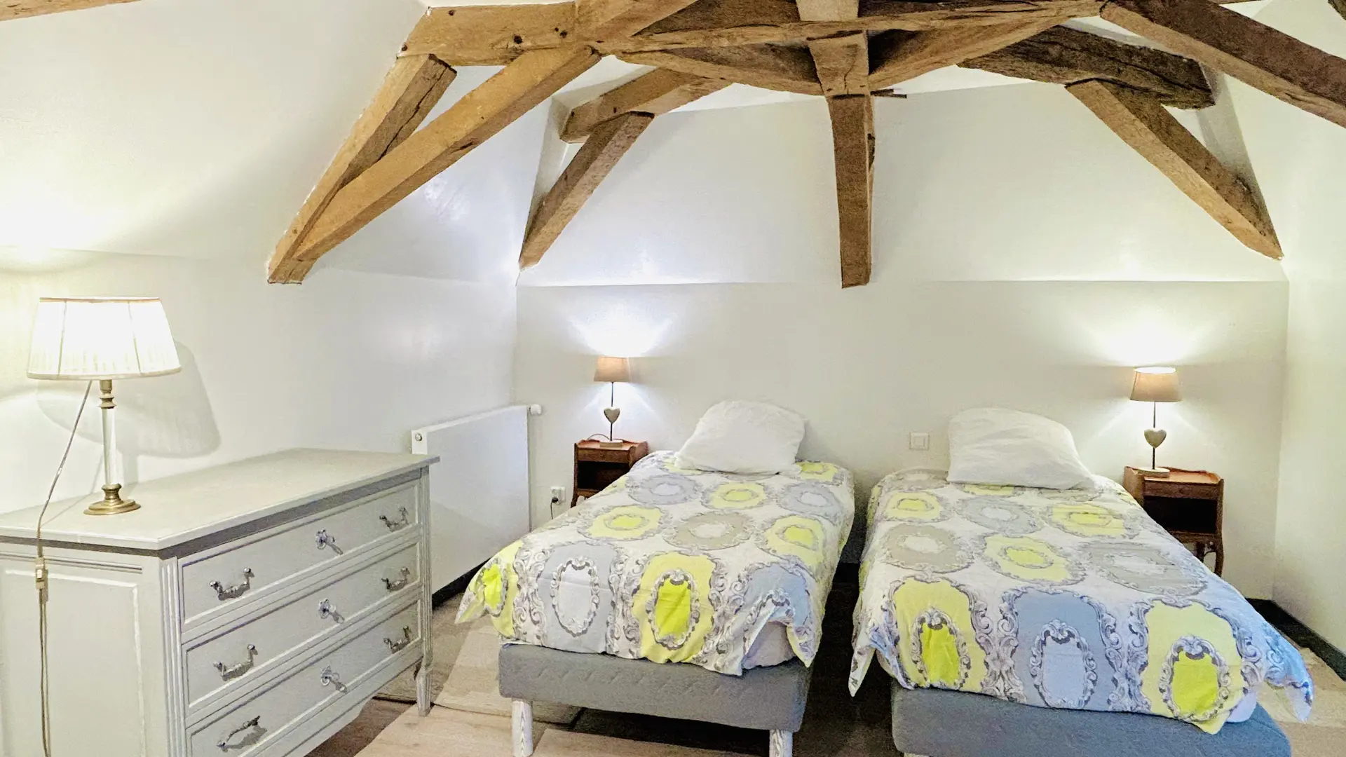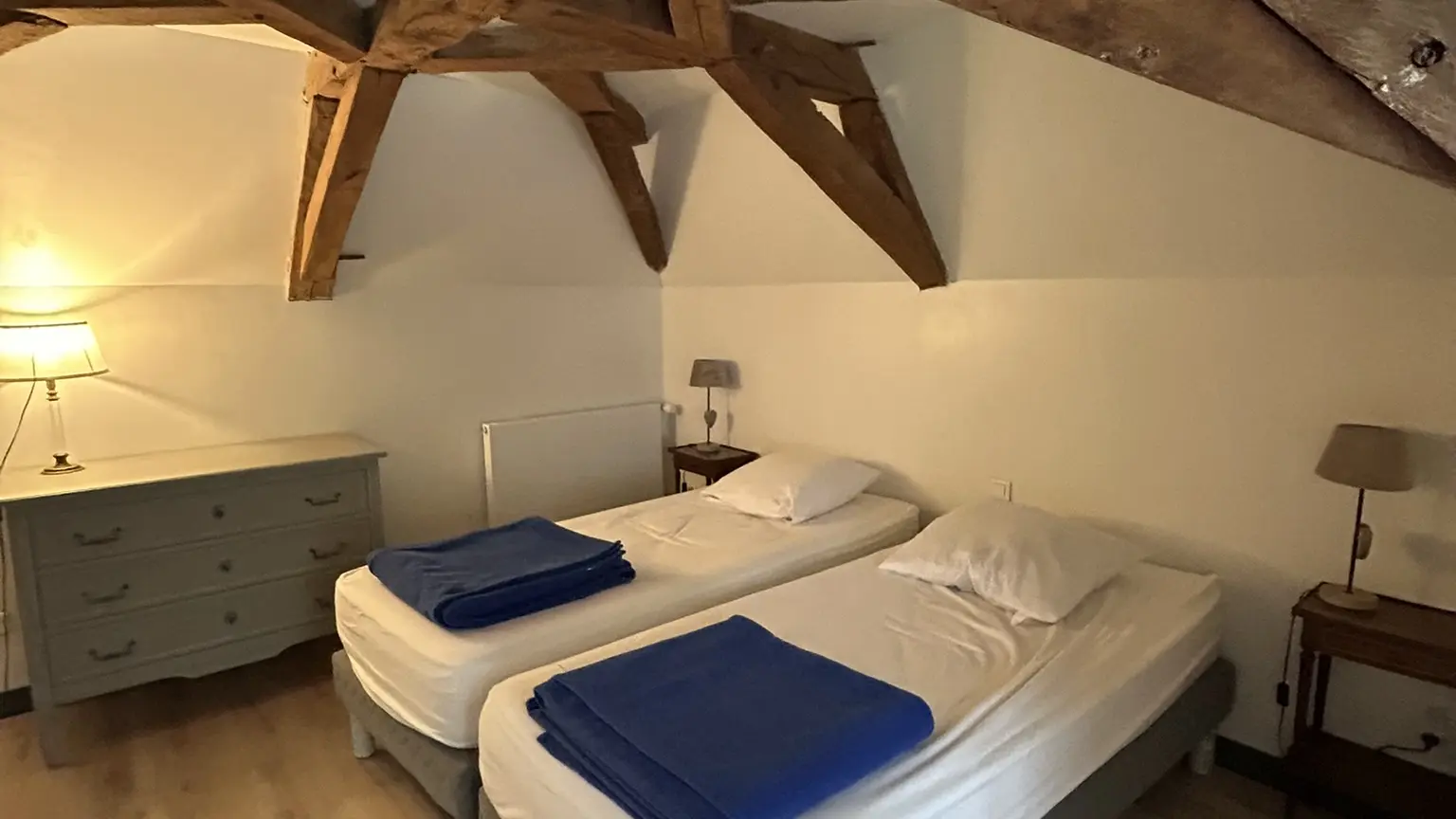 La vie de plain-pied est facilitée avec une première chambre (2 lits 80x200 modulables), une salle de bain et des WC séparés. À l’étage, sous une charpente traditionnelle, une seconde chambre accueille deux lits 90x200 (jumelables selon vos besoins).