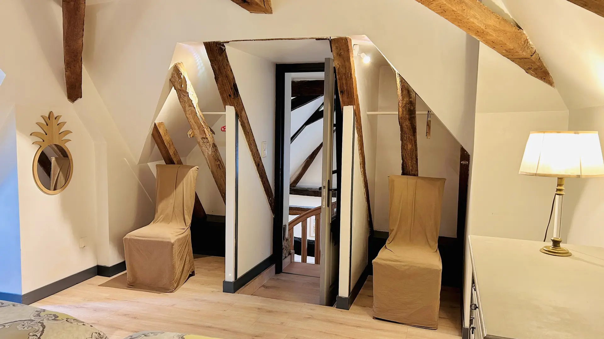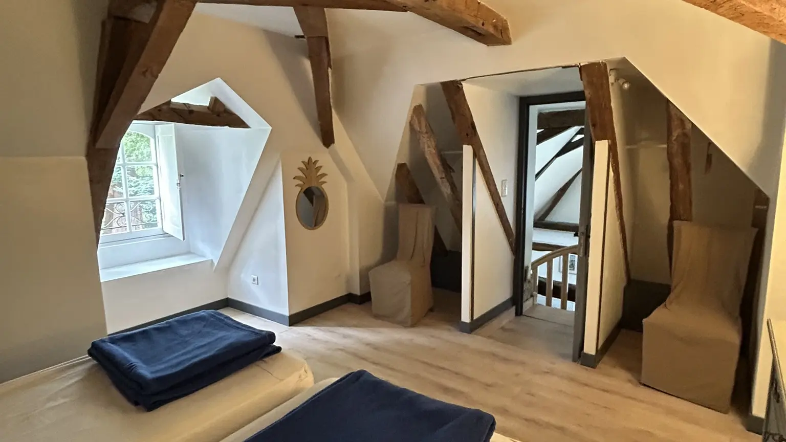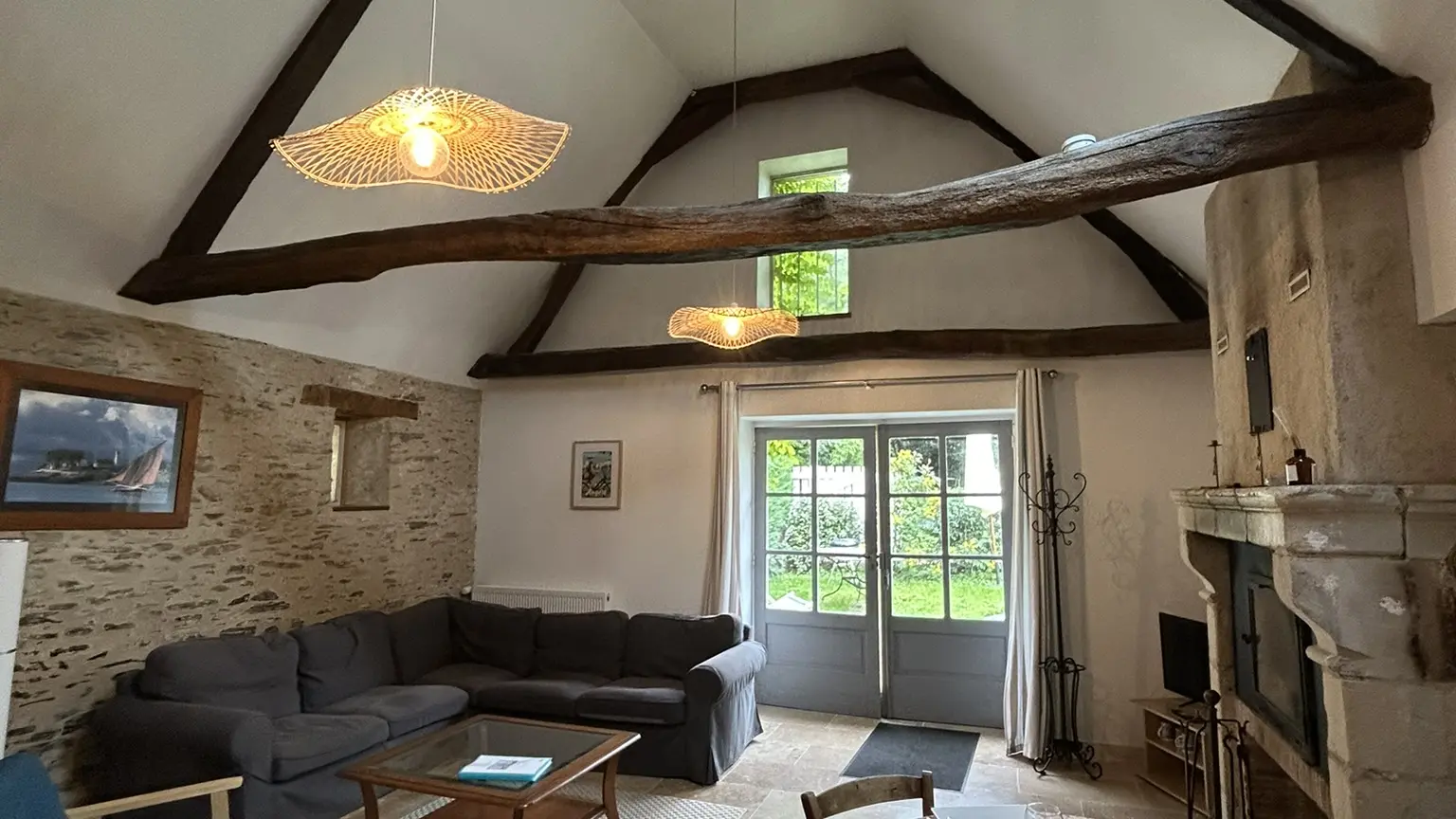 La vie de plain-pied est facilitée avec une première chambre (2 lits 80x200 modulables), une salle de bain et des WC séparés. À l’étage, sous une charpente traditionnelle, une seconde chambre accueille deux lits 90x200 (jumelables selon vos besoins).