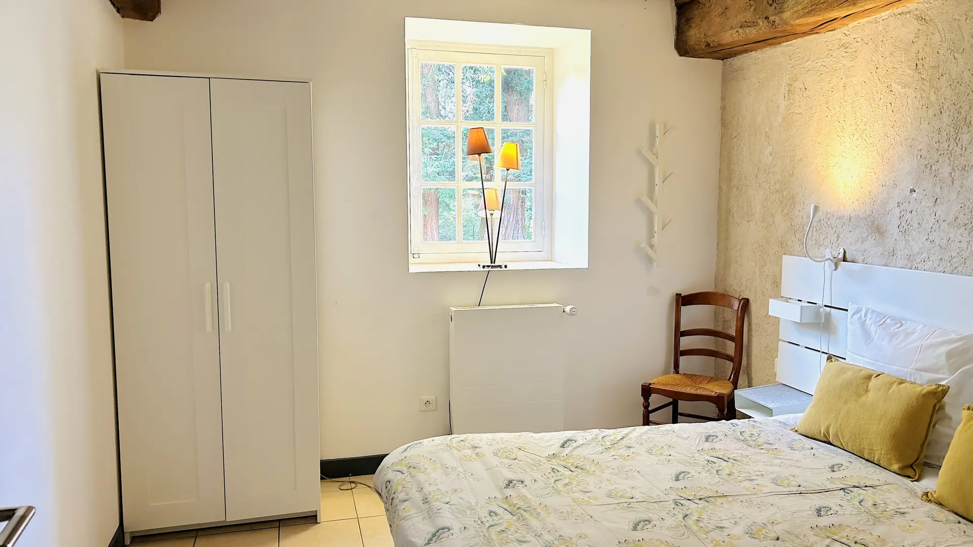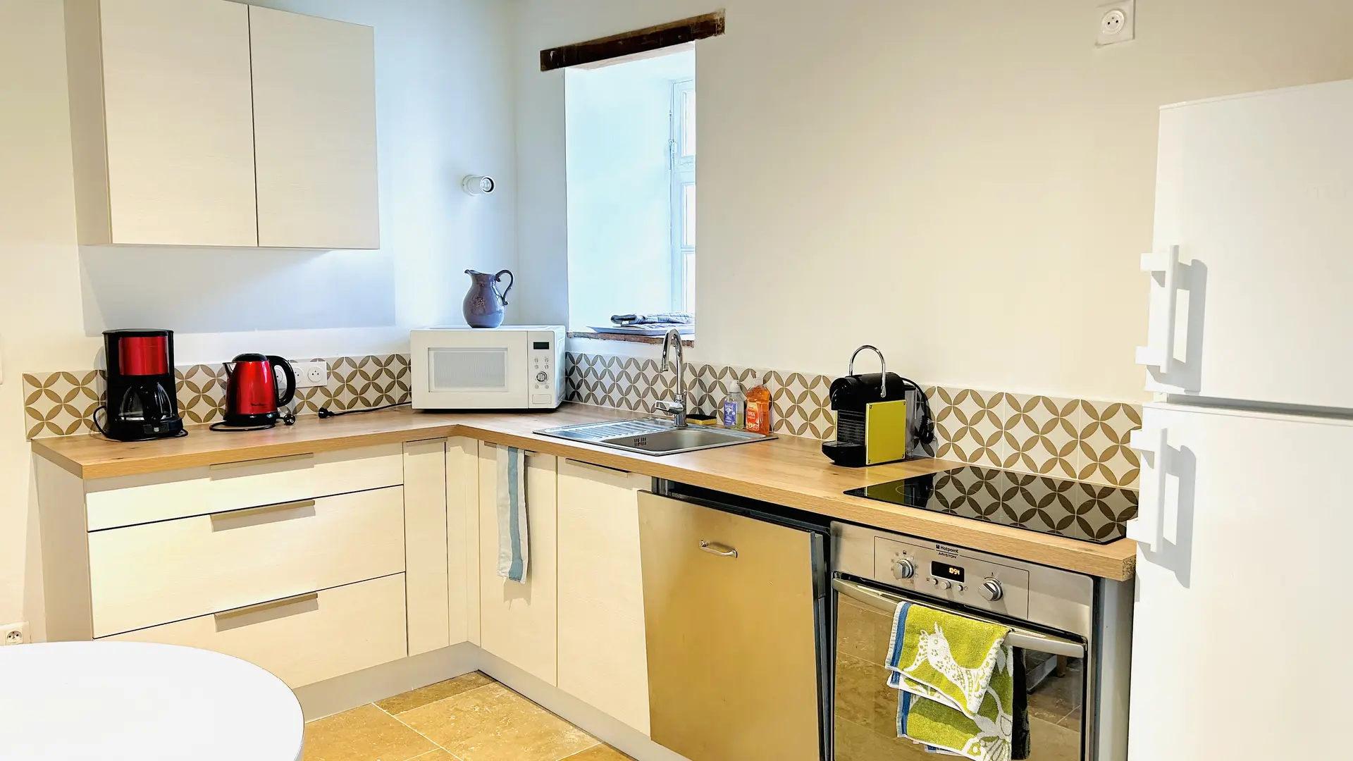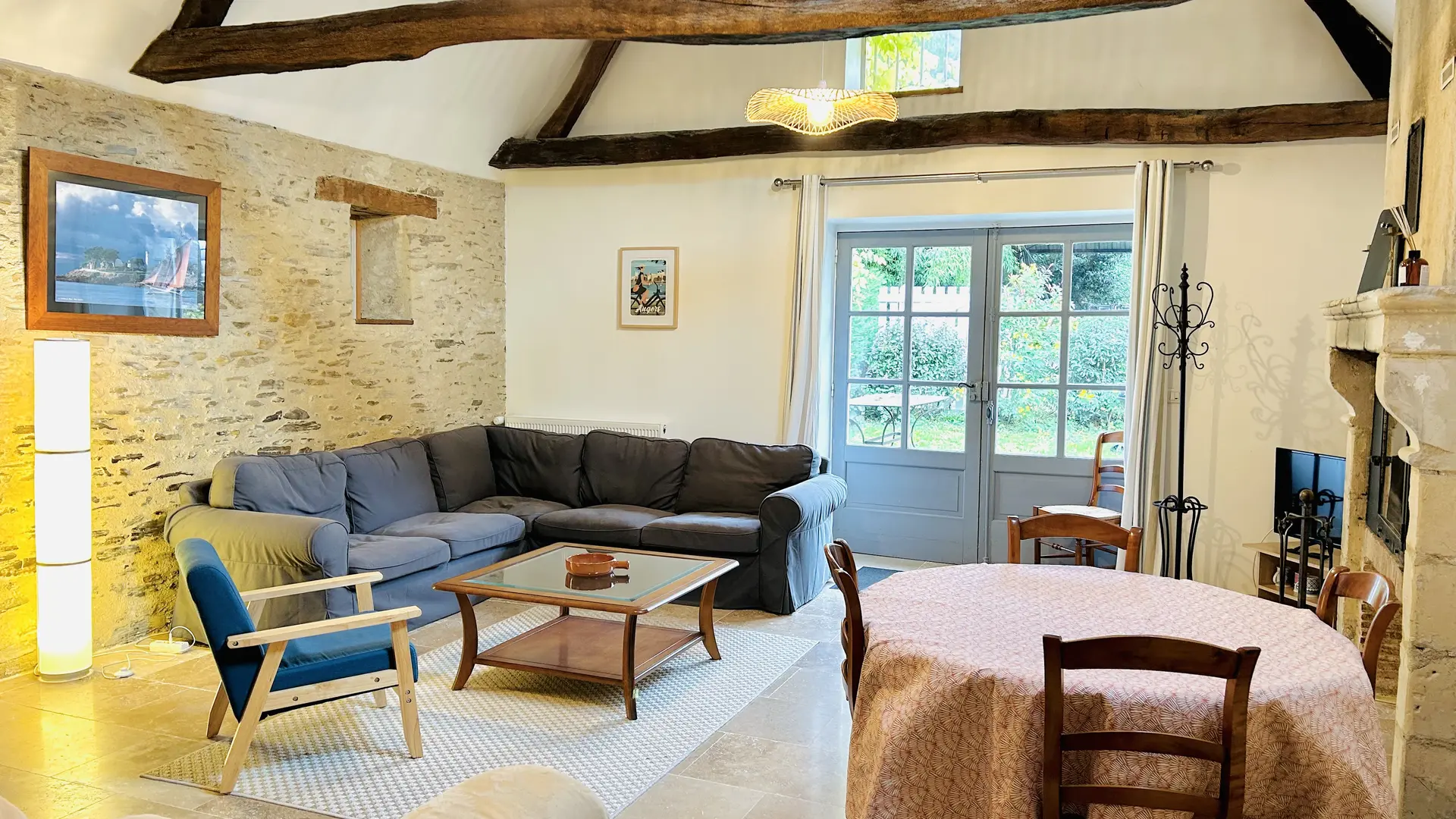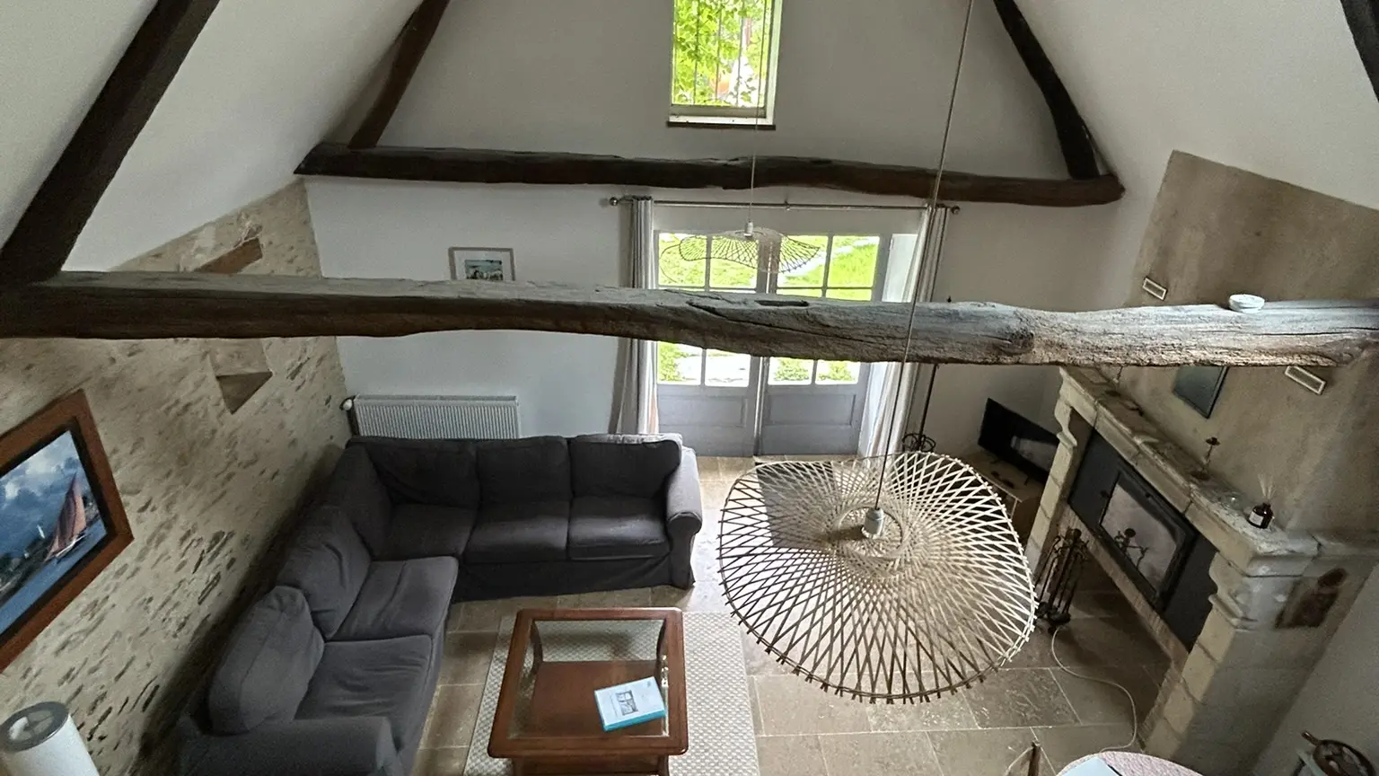 Cette jolie maison en pierres allie authenticité et confort. Vous profiterez d’une grande pièce de vie de 30 m², lumineuse, avec de belles hauteurs sous plafond, murs en pierres apparentes, insert bois, canapé d’angle, coin repas et télévision. La cuisine indépendante est entièrement équipée.