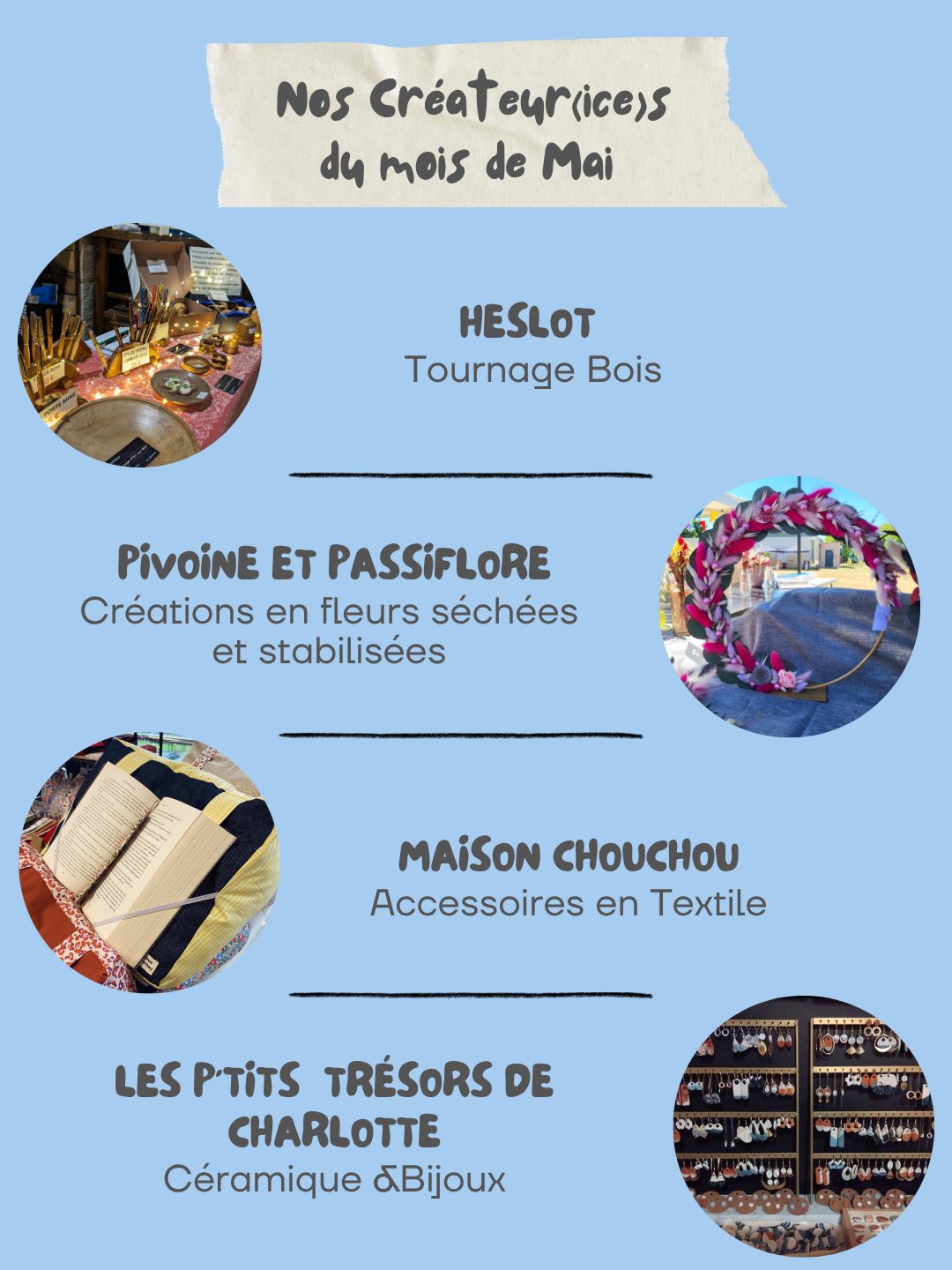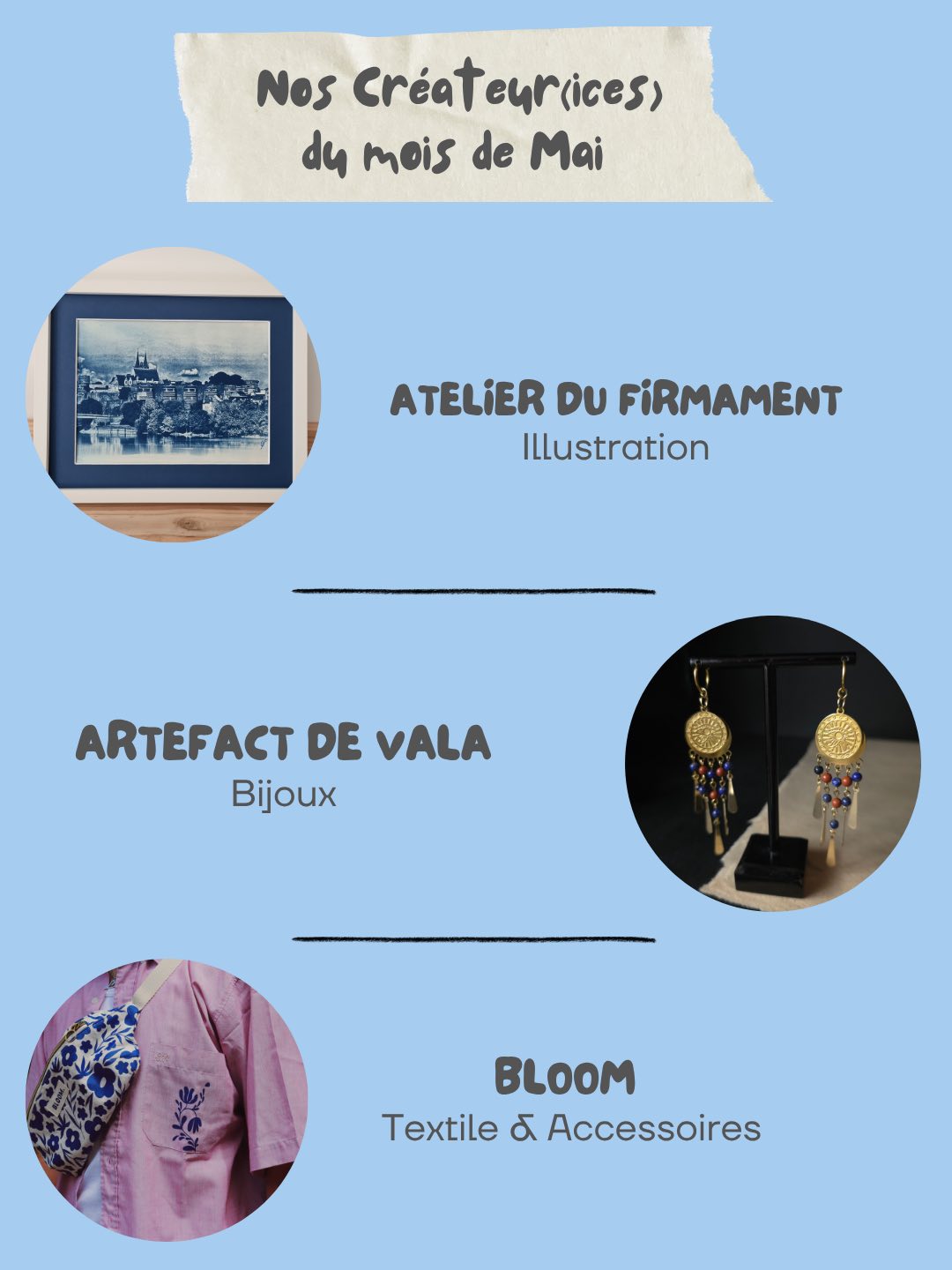 - illustrations (aquarelle, feutre, encre, collage), Bijoux, textile fait main en Anjou (vêtements, écharpes, sacs, accessoires), teinture végétale sur textile, céramique, objets déco en bois tourné, maroquinerie, création couture autour du livre…